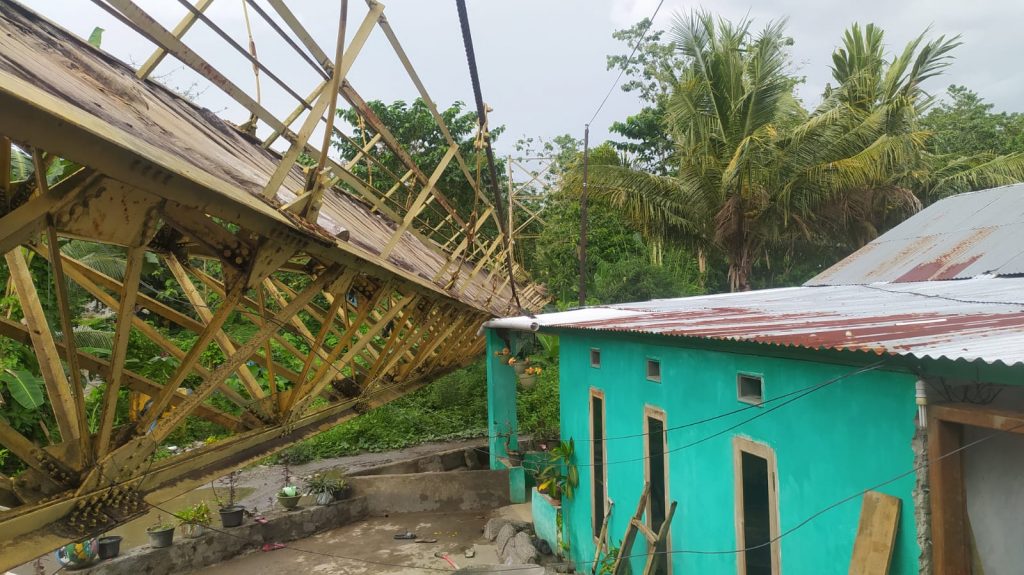 “Kejadiannya sekitar jam 2 malam, suaranya itu mirip suara gempa dan getarannya cukup kuat, setelah saya keluar melihat ternyata jembatan yang hampir roboh, salah satu talinya putus, untung tidak dua-duanya putus,”kata bahar saat diwawancarai Minggu (18/12)