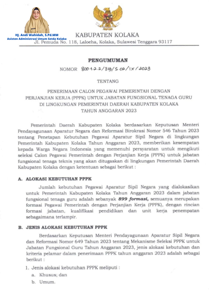 SEPUTAR,KOLAKA.ID-Pemerintah Kabupaten Kolaka mengumumkan penerimaan calon pegawai pemerintah dengan perjanjian kerja (PPPK) untuk jabatan fungsional tenaga guru tahun anggaran 2023.
