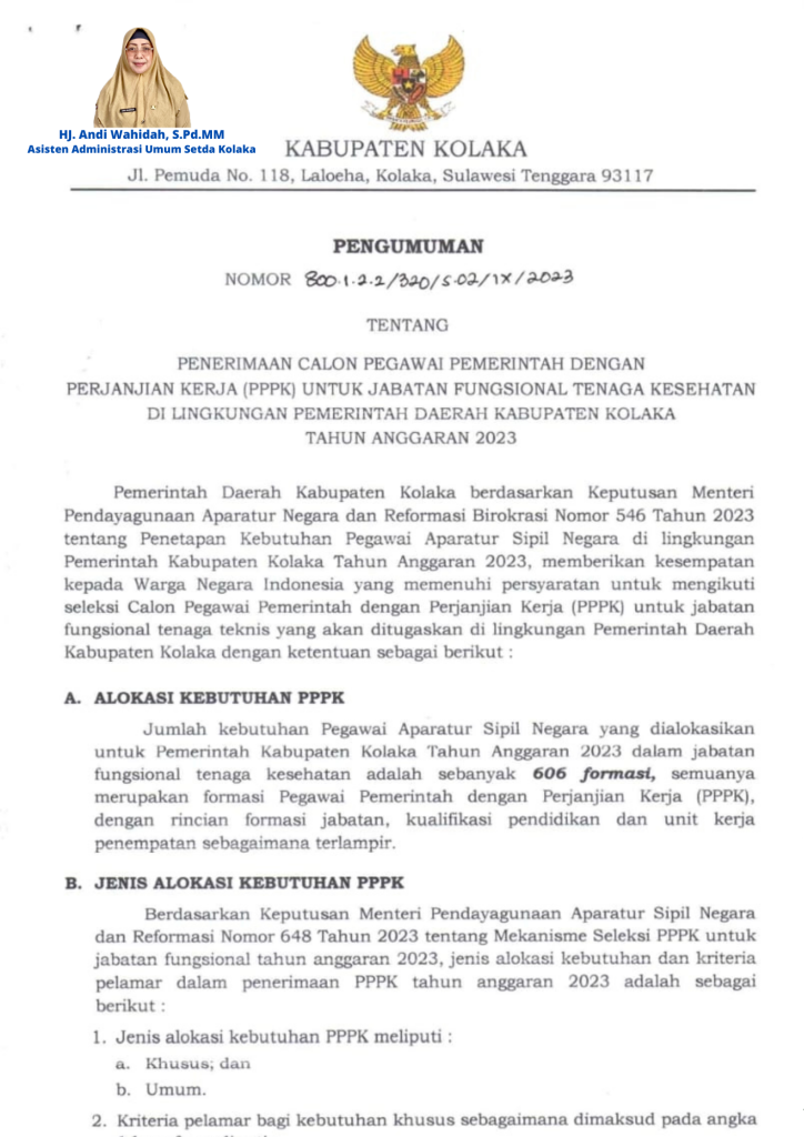 SEPUTAR,KOLAKA.ID-Pemerintah Kabupaten Kolaka mengumumkan penerimaan calon pegawai pemerintah dengan perjanjian kerja (PPPK) untuk jabatan fungsional tenaga kesehatan tahun anggaran 2023.