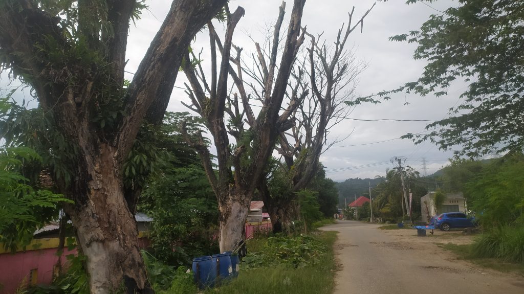 SEPUTAR,KOLAKA.ID-Pohon mahoni kering yang berada di perempatan Jalan SD Negeri 2 Lalombaa, Kecamatan Kolaka membahayakan para pengendara yang melintas di jalan tersebut, pasalnya lima pohon yang berdiri dijalan itu terlihat sudah mengering akibat dikuliti batangnya oleh warga sekitar.