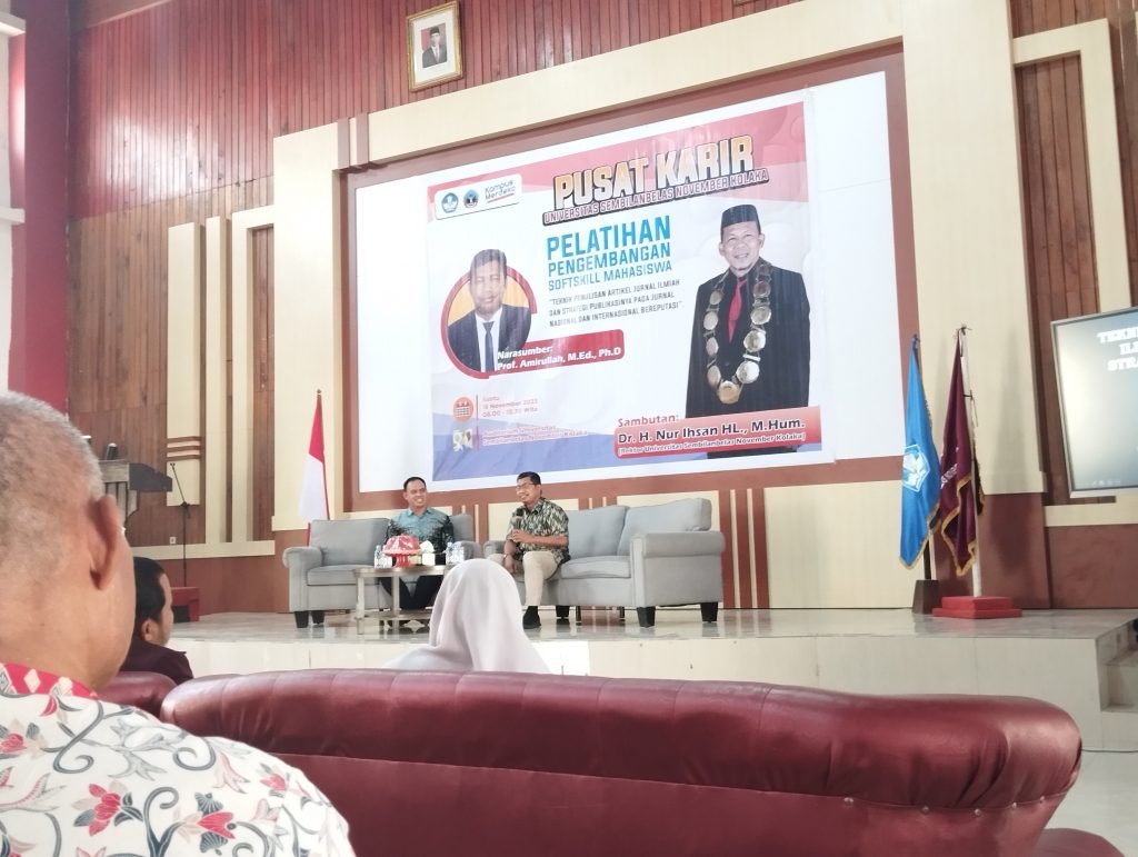 SEPUTAR,KOLAKA.ID-Universitas Sembilanbelas November (USN Kolaka) menggelar pelatihan pengembangan soft skill Mahasiswa dengan judul “Teknik Penulisan Artikel Jurnal Ilmiah dan Strategi Publikasinya pada Jurnal Nasional dan Internasional Bereputasi di Auditorium Kampus Sabtu (18/11).